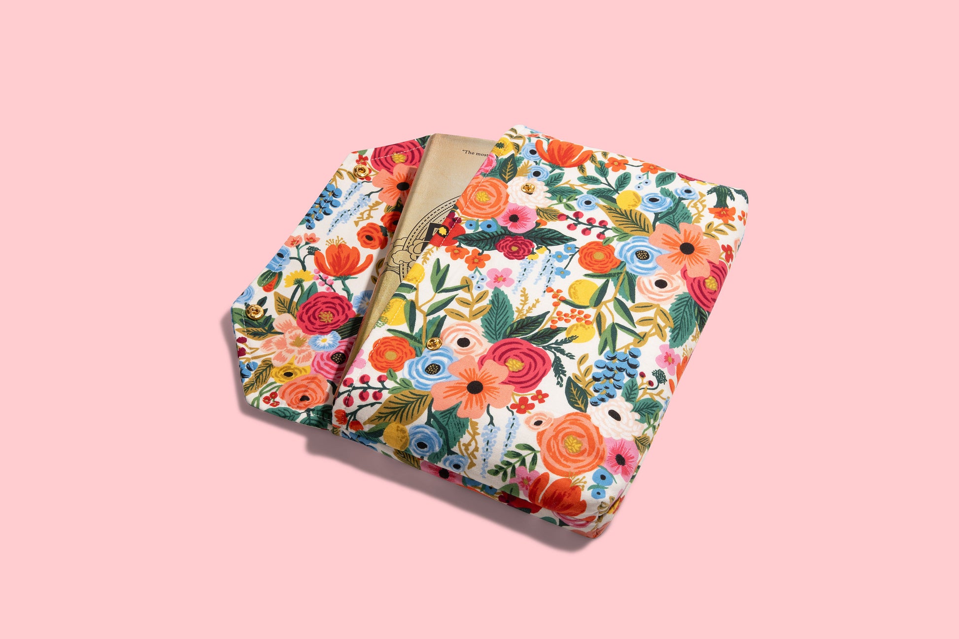 Protect your favorite books with this deluxe envelope style protective book sleeve made from 100% cotton fabric with additional added padding in an eye catching print with fabric from Rifle Paper Company.